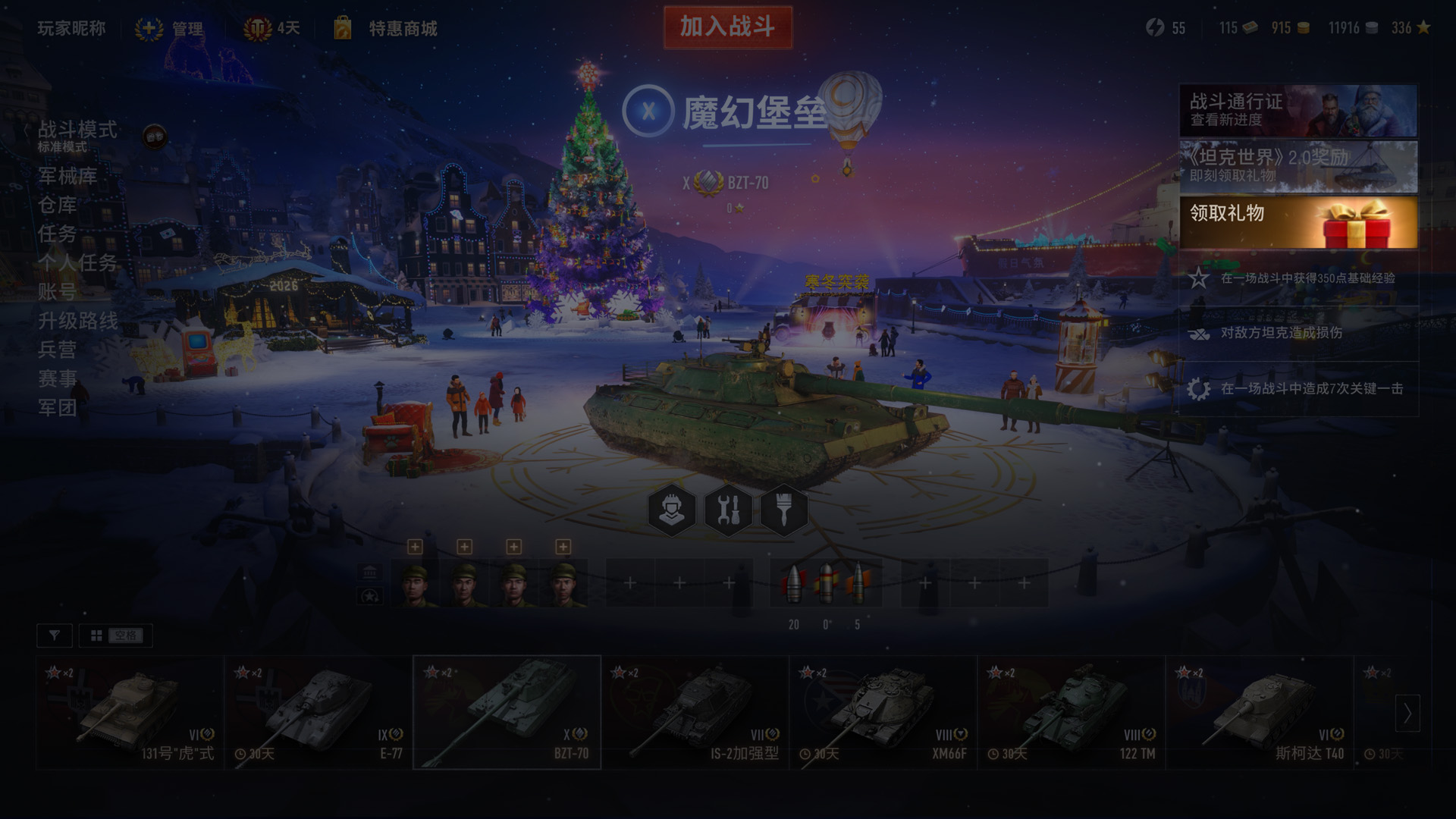 12月19日至31日,仅需登录游戏即可在车库中开启礼物,然后驾驶其中的独特坦克迎接新的一年。