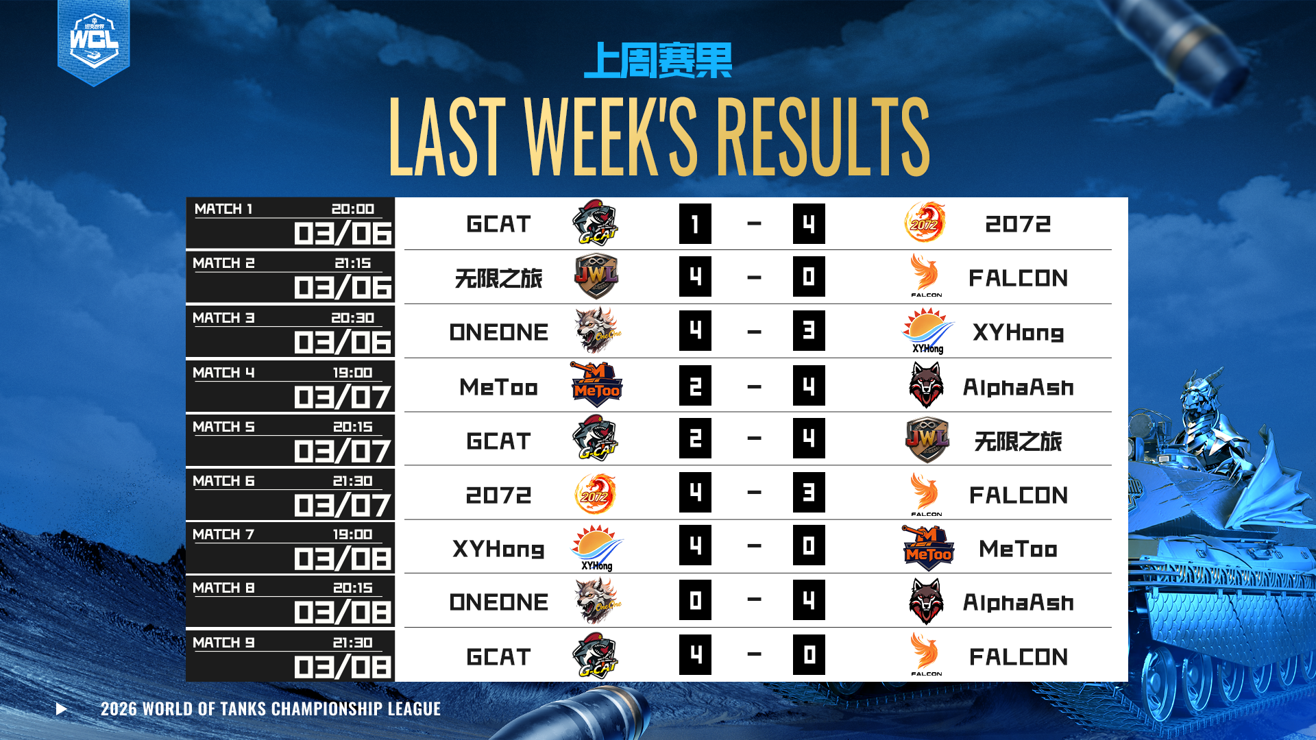 WCL春季赛迎来了极其疯狂的“零封之夜”!三场比赛全部以4:0的大比分光速下班:XYHong上演绝境逆转给新秀“上课”;AlphaAsh爆出开赛最大冷门惊天横扫ONEONE;GCAT则找回状态碾压FALCON。
